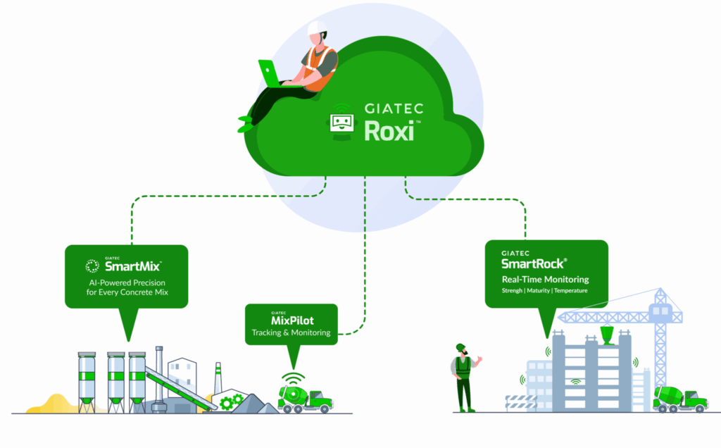 The combination of IoT sensors and AI analytics is transforming how teams monitor materials like concrete. Wireless sensors like Giatec SmartRock® embedded in concrete continuously monitor in-situ conditions (temperature, strength gain, curing progress) in real time. This constant data stream gives project teams immediate insights to adjust curing or optimize mix designs, ensuring quality targets are met without guesswork. The real advantage comes when AI platforms analyze this sensor data alongside thousands of records. For instance, Giatec SmartMix™, powered by the AI assistant Roxi™, compares concrete data to historical mix performance. It can recommend mix adjustments on the fly for optimal strength and efficiency. By learning from vast data, AI helps deliver stronger concrete with less cement, cutting material costs and carbon footprint at the same time.